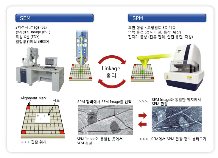 SEM-SPM에 공통 좌표 Linkage 홀더가 있어 동일 시야의 형상, 구조, 조성, 물성을 빠르고 간단하게 관찰, 분석할 수 있도록 하였습니다.